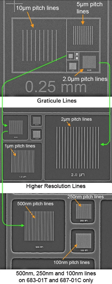 NIST traceable* with features from 2mm to 100nm for magnification 10x-200,000x for SEM, FE-SEM and FIB.