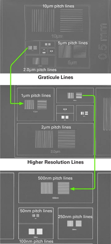 NIST traceable* with features from 2mm to 50nm for magnification 10x-200,000x for SEM, FE-SEM and FIB.
