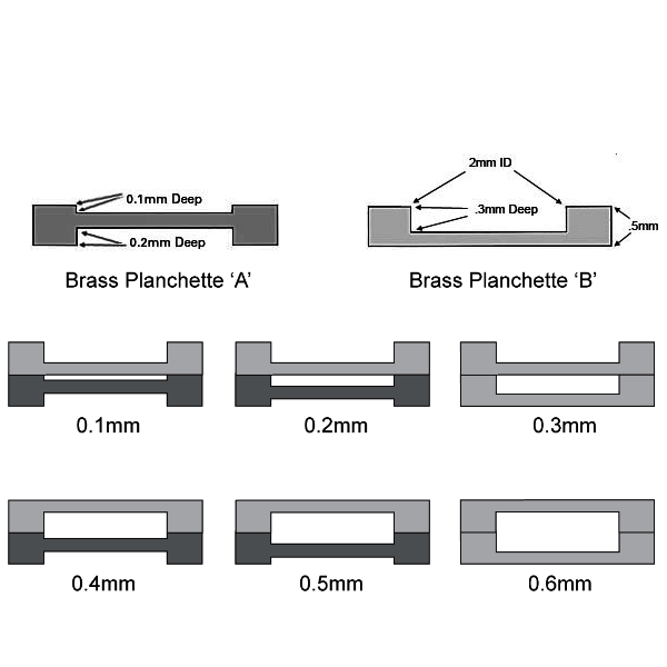 Using two planchettes, one on another, in various combinations, allows cavity thicknesses of 0.1, 0.2, 0.3, 0.4, 0.5 and 0.6mm to be achieved.