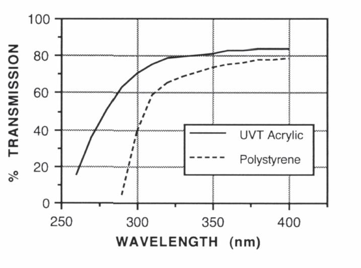 Plastic slides do not leave any sharp edges when broken. Two versions of plastic microscope slides are offered. One is made of general purpose “crystal” polystyrene and the other is made of UVT (UV Transmittable) acrylic.