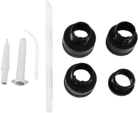 Dual graduations, telescopic fill tube, and four additional thread adapters come standard