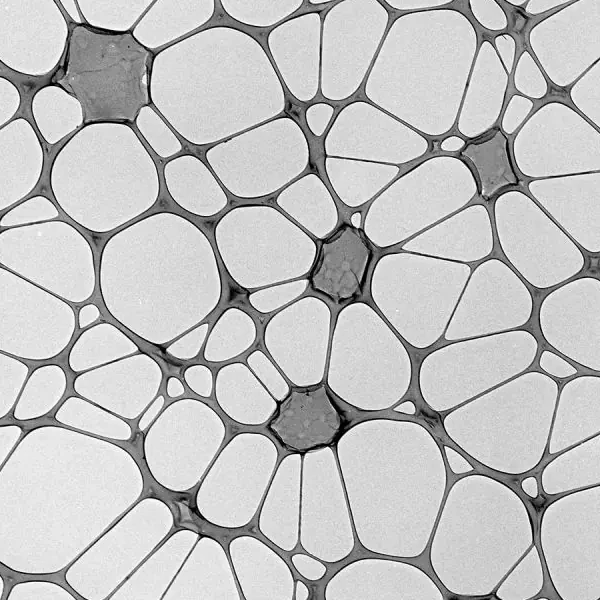 A lacey network support film. The holes in the lacey support film vary in size from less than a quarter micron to more than 10 microns making them ideal for any type of specimen.