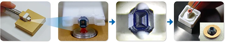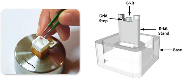 The K-kit is easy. Just touch the carrier to a drop of your liquid sample to have it drawn inside by capillary force.