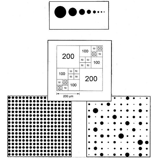2. A root-2 array of spots from 3 m to 48 m diameter is used for determining the threshold level of cameras and microscope systems.