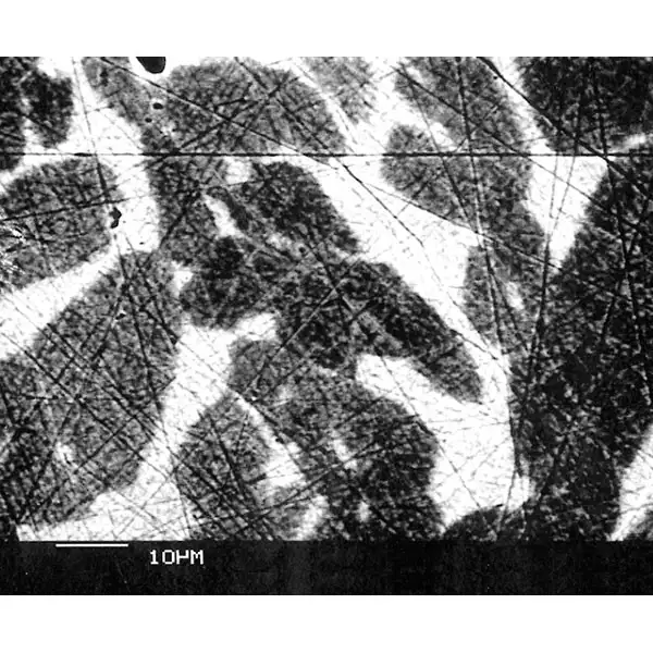 The light phase illustrated in the micrograph has a mean atomic number of 29.47 and the dark phase a mean atomic number of 29.37.