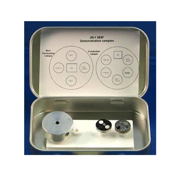 The JN-1 Scanning Electron Microscope Demonstration Standard Specimen demonstration samples on two standard 12.7mm (1/2″) pin stubs and a 25mm mounting adapter.