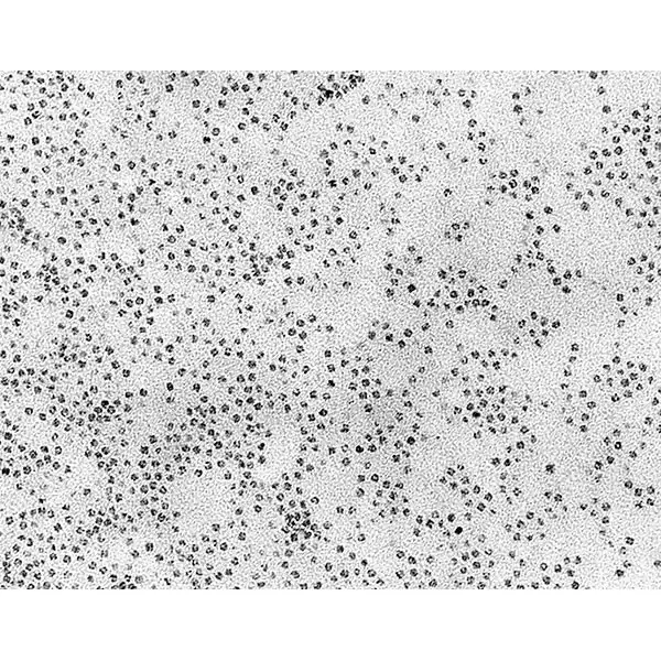 The ferritin is dispersed on a formvar/carbon substrate supported by a G400, 400 square mesh copper Gilder grid.