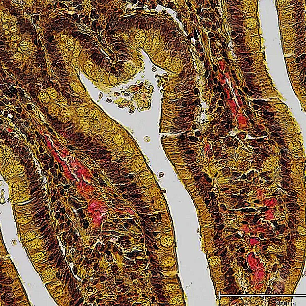 Tartrazine and Phloxine (red) to show Paneth cells in gut.