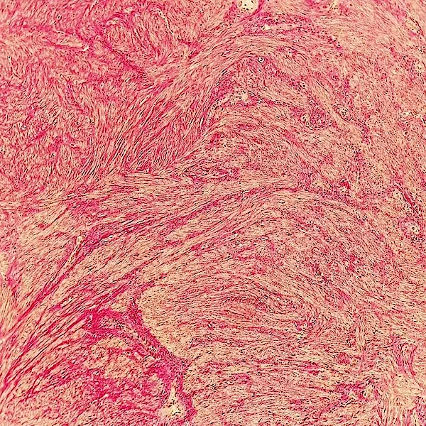 Van Gieson’s stain is a counterstain that is specific for collagen, comprised of two acid dyes – piric acid and acid fuchsen.
