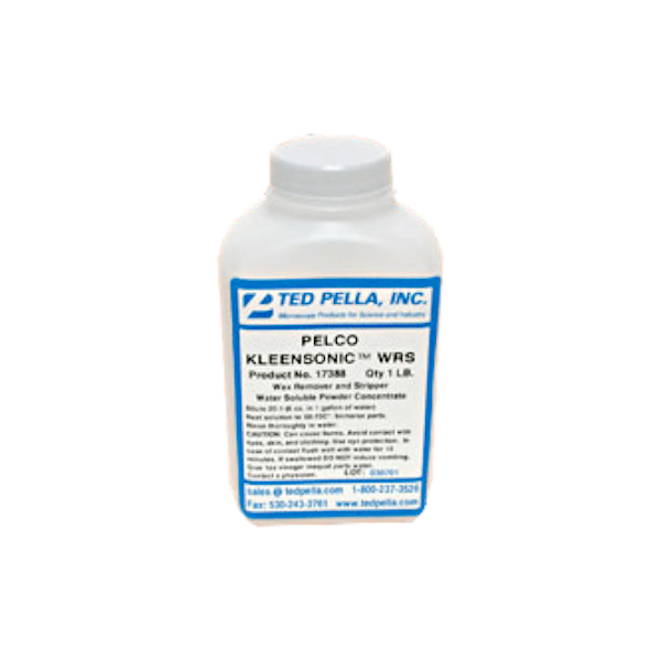PELCO Kleensonic WRS is an environmentally friendly cleaning compound in powder form formulated for removing mounting waxes used in specimen preparation, semiconductor processing and casting.