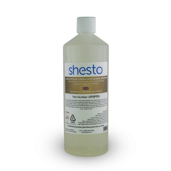 A concentrated ultrasonic cleaner fluid designed in the UK to clean optical lenses, ideal for glasses, contact lenses, optical components, ceramic, and glass.
