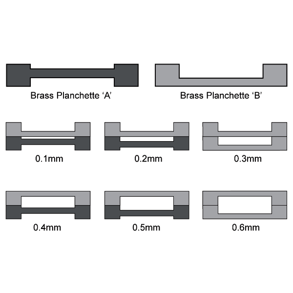 Using two planchettes, one on another, in various combinations, allows cavity thicknesses of 0.1, 0.2, 0.3, 0.4, 0.5 and 0.6mm to be achieved.