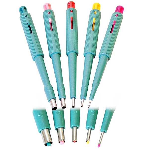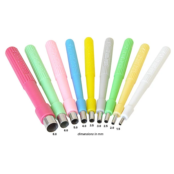 The Biopunch consists of a sure grip hollow plastic embossed handle with a razor sharp seamless stainless steel cutting tip protected by a clear removable cap. Each Biopunch is individually packaged sterile with lot number and expiration date clearly imprinted on the package. Available in 9 core size diameters: 1.5 to 8.0 mm or a Mix Pack of 5: 2.0 to 6.0mm, all punches are color coded by size. Maximum depth: 8mm