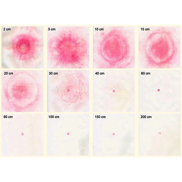 | Chemographic test samples with synthetic GSR distributions These Chemographic test specimens have been developed for the optimisation and validation of chemographic methods for Shooting Distance Determination (SDD) forensic work along with other applications.They are suitable as sample material for inter-laboratory tests according to ISO-Guide 43-1 and 2 or DIN/ISO 5725, as they meet the DIN/ISO requirements for identical sample material.GSR pattern distributions containing lead (Pb), are printed on the surface of a textile sample using a special, patent-protected printing process. The applied distributions simulate typical GSR distributions from different shooting distances (synthetic GSR) or serve to control the applied dyeing/staining process (Homogeneity & Resolution Limit). They are suitable for chemographic staining of the lead (Pb) distribution with both the reagents sodium rhodizonate and with sodium sulphide. Two sets are available: Synthetic GSR distributions The ‘comparison shot series’ consists of 24 textile samples. The applied distributions simulate typical GSR pattern applications for distances of 20, 50, 100, 150, 200, 300, 400, 600, 800, 1000, 1500, and 2000mm. The set consists of 2 x 12 samples as illustrated and is particularly suitable for testing the quality of the staining process on actual samples or for validating the process.