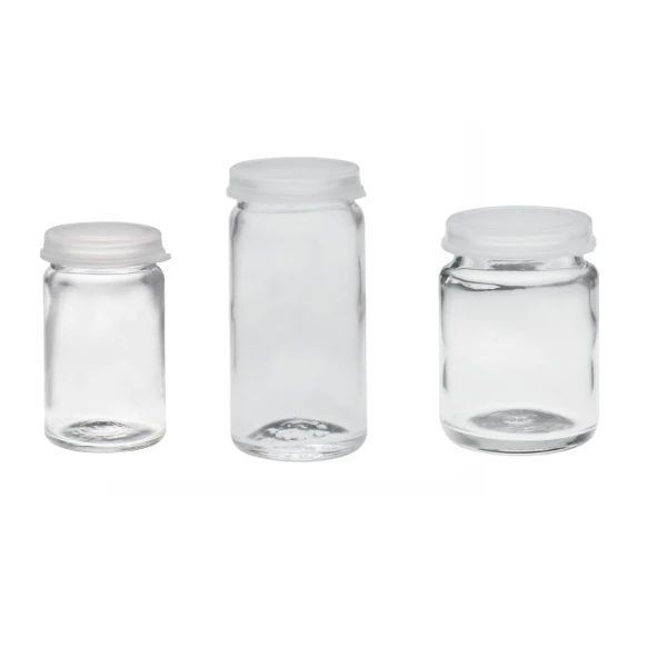 Clear glass sample vial with polyethylene stopper cap. 15ml capacity.