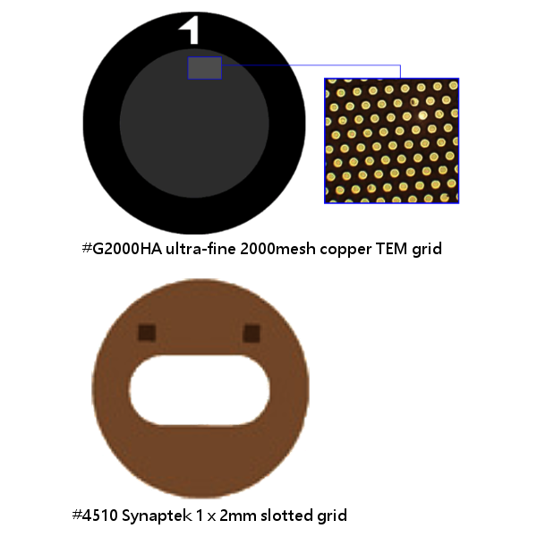 Transmission for this type of grid is 41%. The ultra-fine 2000 mesh TEM grid is supported by #4510 Synaptek 1 x 2mm slotted grid to give it the required stiffness.