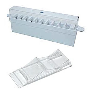 The Rack and Coverplate System Slide Rack holds glass slides with a Coverplate™. This combination forms a capillary gap between the slide and the plate. Reagent volumes are greatly reduced using this versatile system.