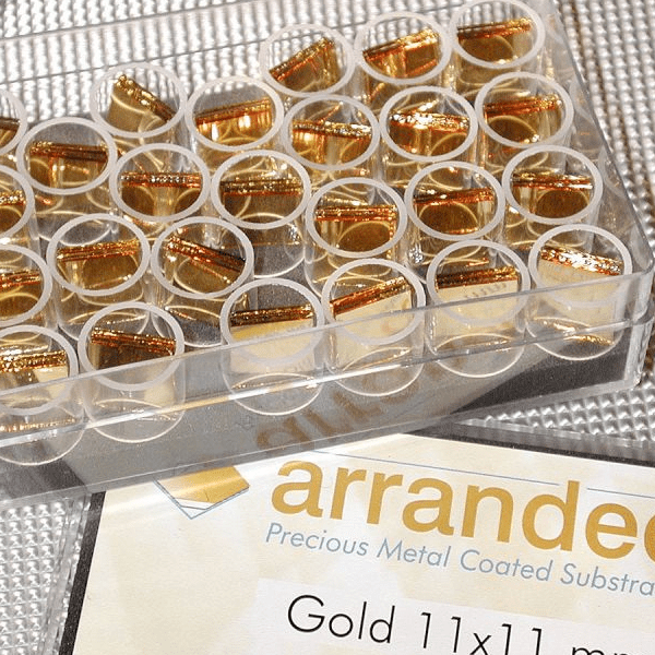 Arrandee gold-coated substrates use a borosilicate glass base of 0.7mm thickness.
