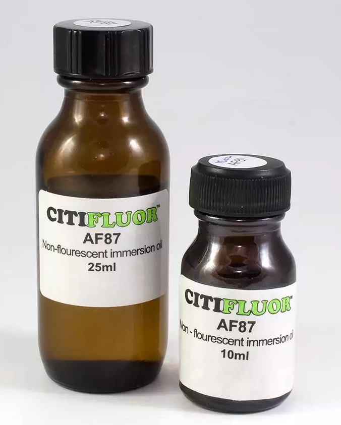This Citifluor non-fluorescent immersion oil contains antifadent AF87.