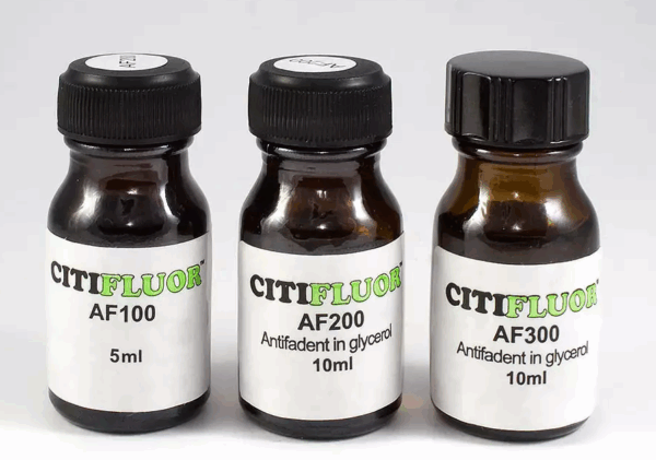 The antifadent solutions AF1, 2 and 3 were specifically developed for use with FITC polyclonal antibodies but their use is now far more widespread. They show improved signal preservation with many other fluorochromes, including rhodamines and DAPI. AF4 contains the antifadent n-propyl gallate, which is particularly suitable for use with DAPI and Alexa dye-stained materials, as well as FITC-labelled materials