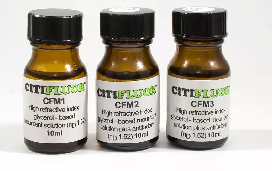 The CFM solutions have been specially formulated to have a refractive index of 1.52 (similar to glass), so that effects of refraction on image quality are minimised. They are particularly useful for high magnification work and may also be used as immersion oils. They are valuable for laser scanning microscopy where three dimensional imaging of specimens is carried out. CFM solutions should only be used with fixed (cross-linked) samples.