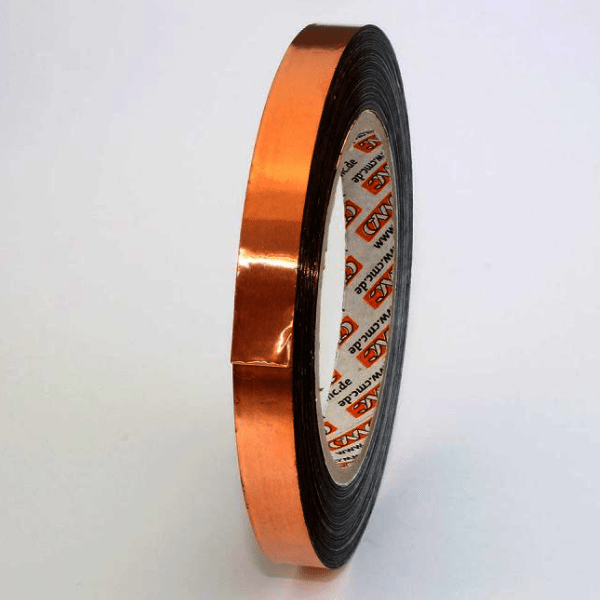 The tape is dead soft copper with a conductive acrylic adhesive. It is supplied on a removable liner for easy handling and cutting.