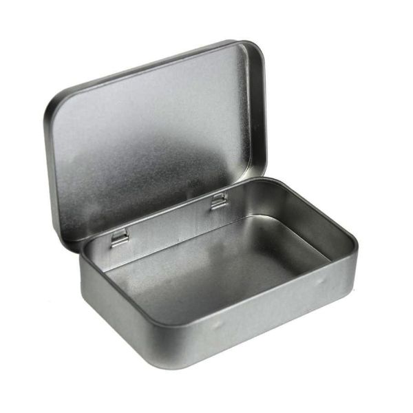 A small tin box with hinged lid, useful for storing samples, holders or parts.