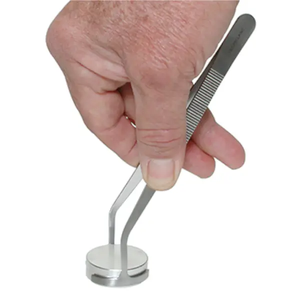Stainless steel gripper tweezers/forceps specially made for handling and transporting grooved SEM pin stub mounts.