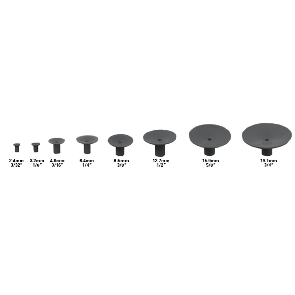 Buna-N cups are two each of 3.2, 6.4 and 9.5mm (1/8″, 1/4″, 3/8″).