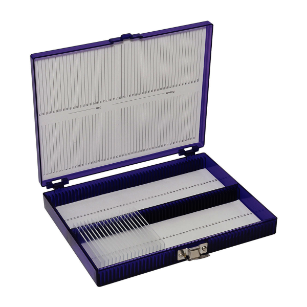 The slide box has a 100-slide capacity with grooved slots to prevent slide to slide contact with a permanent identification sheet in the hinged lid that corresponds to the numbering on the temperature-resistant foam lining in the base.