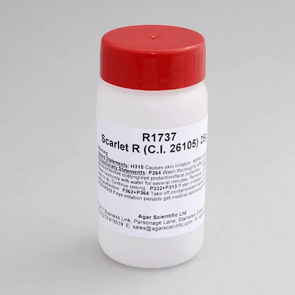 This stain is a hydrophobic azo dye which is used to colour nonpolar substances such as oils, fats, waxes, greases, various hydrocarbon products and acrylic emulsions.