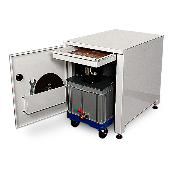It contains a storage door for tools and cut-off wheels, a drawer on top and a space for the recirculation tank.